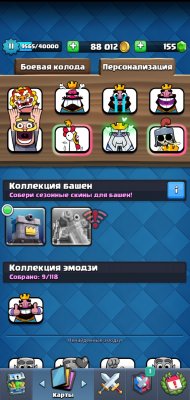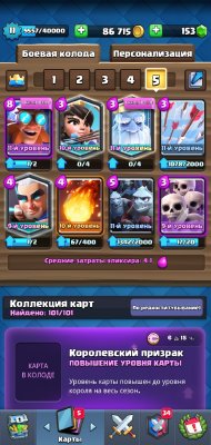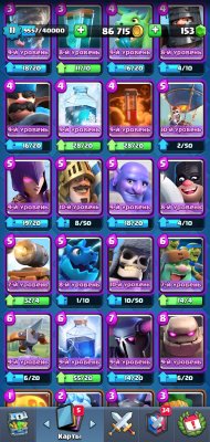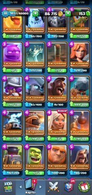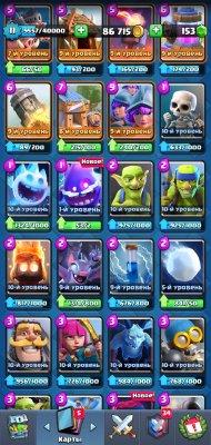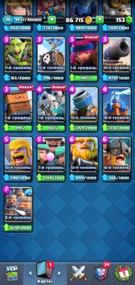 Доступны все карты до 11 уровня, но есть 90к золота с помощью которого вы можете их прокачать, также 155 гемов.