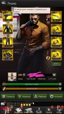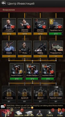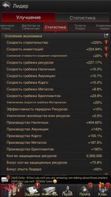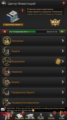 Здание инвестиции, зал клана, комнаты допросов и заключения 25ур. Экономика 100%, Защита 64%, Вооружение 95%, Наемники 60% итд...