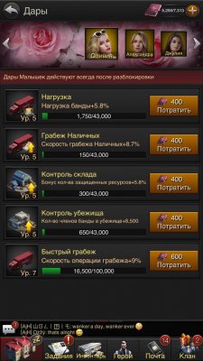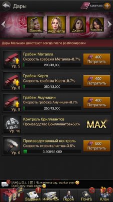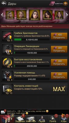 4 девушки максимального (5) уровня, последняя девушка 4ур. В дарах контроль инвестиций и контроль бриллиантов MAX (10ур), все остальные 4+ ур
